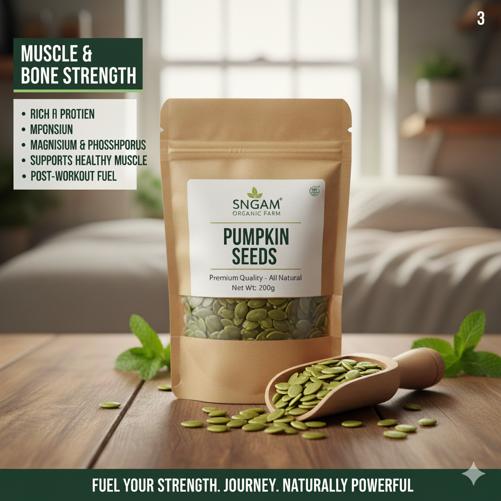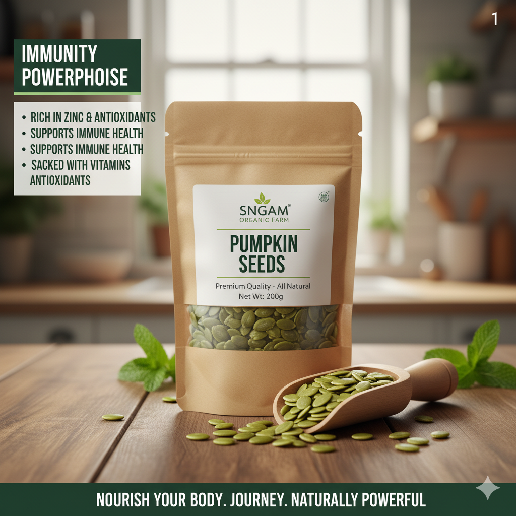 Sangam Organic Farm Organic Pumpkin Seeds are premium-quality organic pumpkin seeds online in India packed with powerful nutrients that support a healthy lifestyle. Carefully sourced from trusted farmers and grown using natural and chemical-free farming practices, our pumpkin seeds deliver purity, freshness, and natural nutrition.
